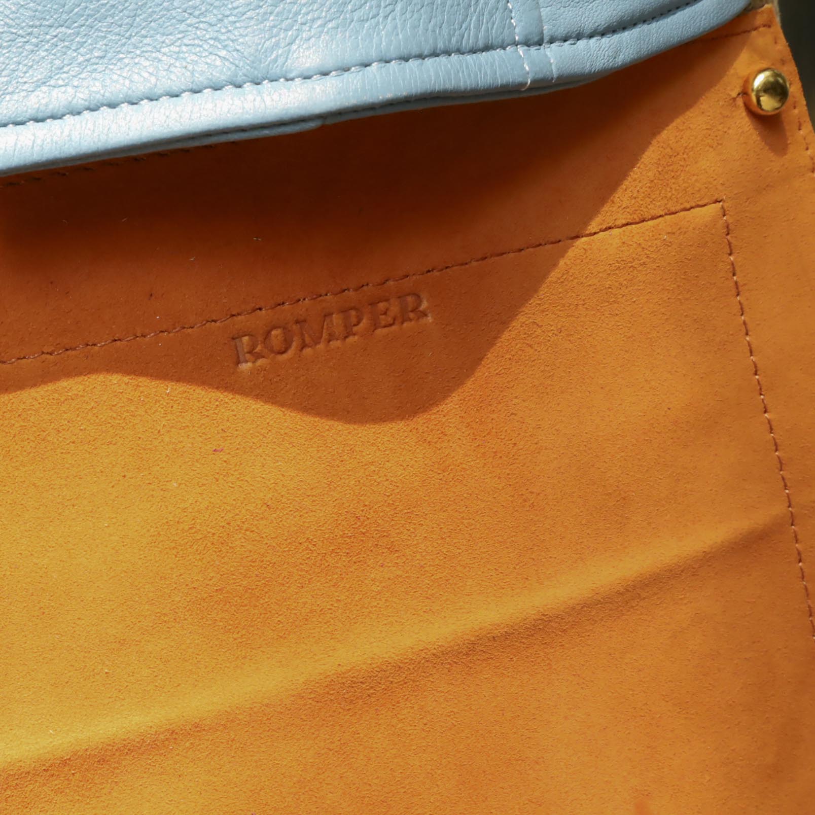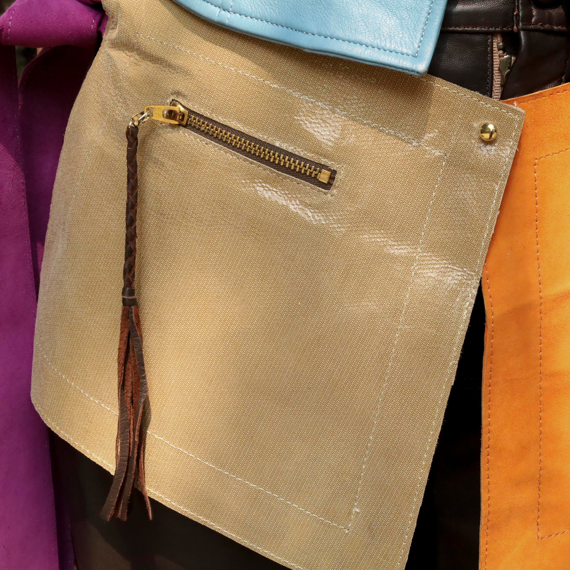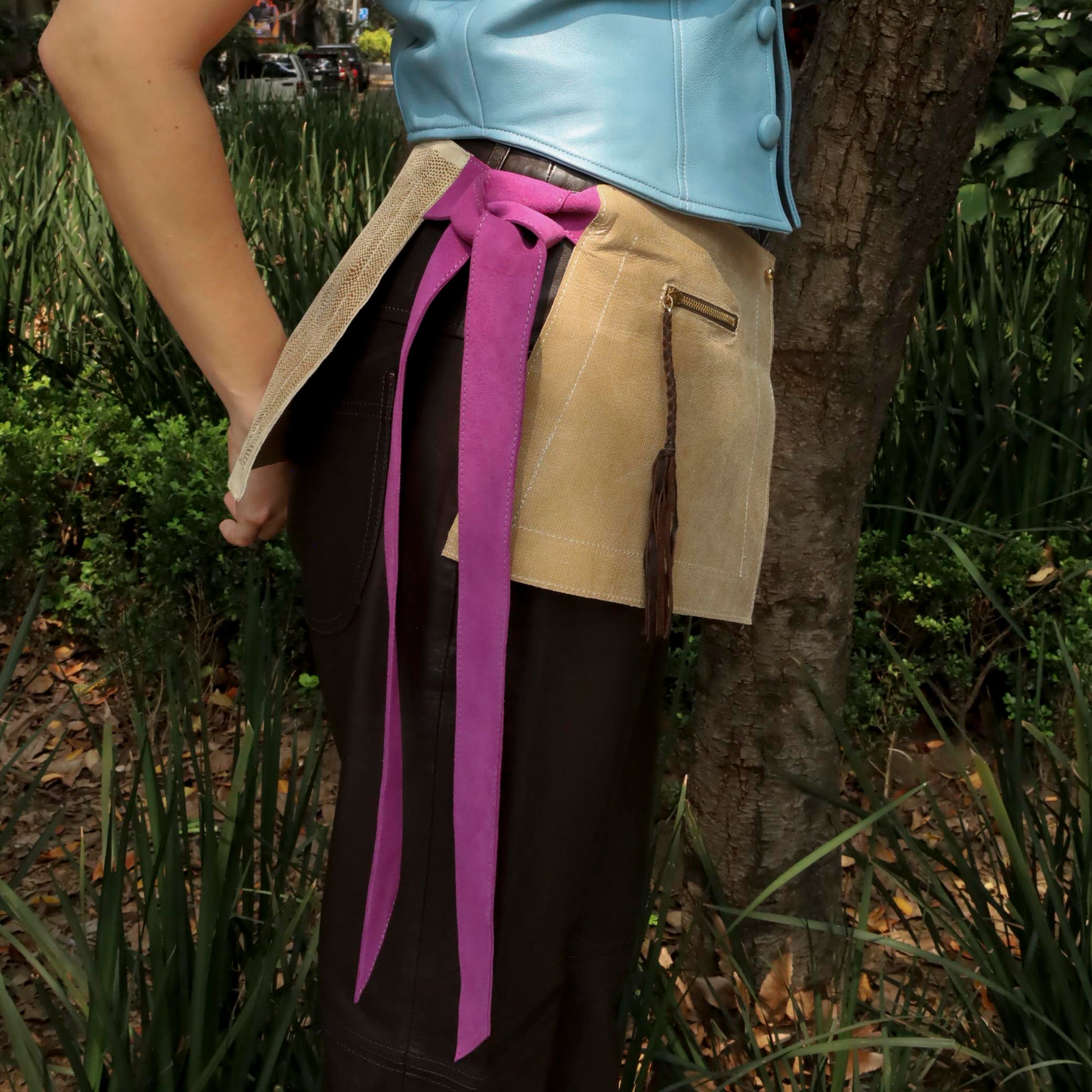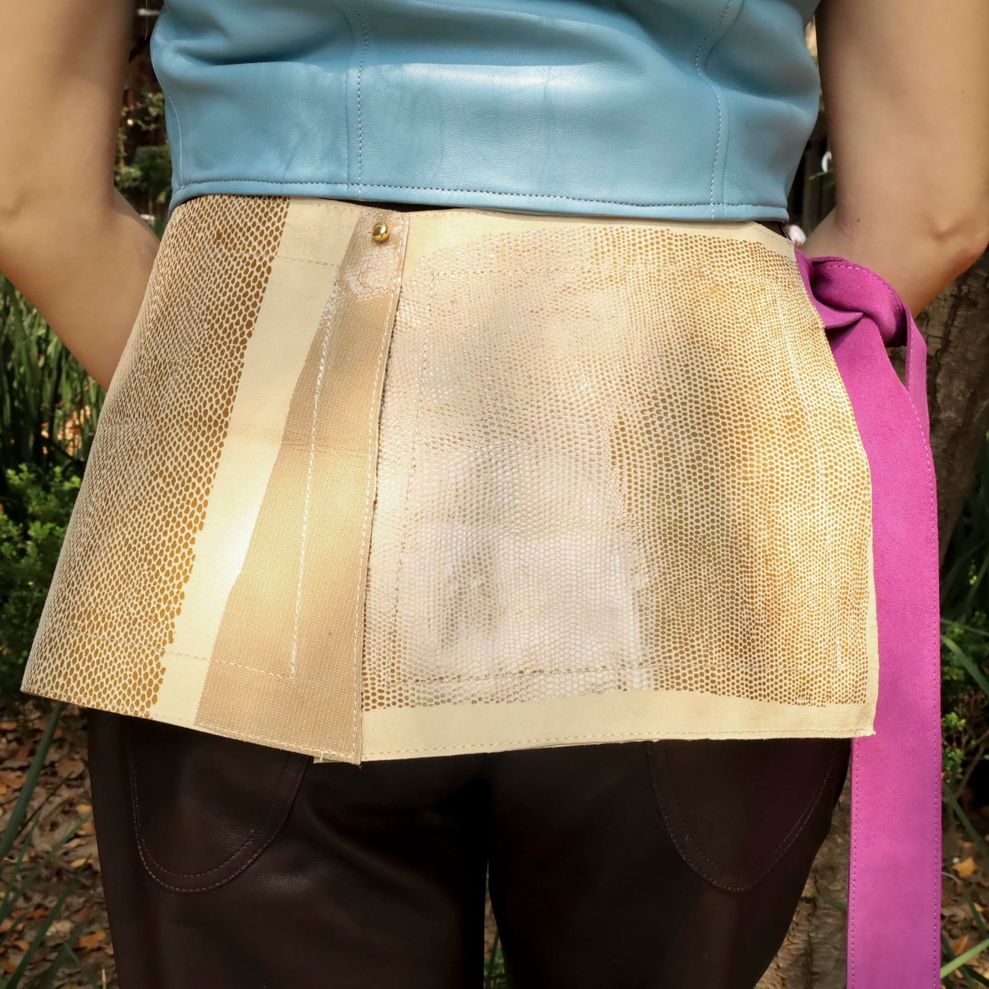 One-of-a-kind. Pieces in ivory snakeskin embossed suede and one piece in orange suede. With purple suede straps. Only one piece made with this particular leather combination.